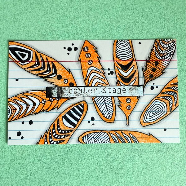 Ok day 27 I stamped a solid feather image with orange ink and then went to town on doodles to make than all different! the sentiment sticker was from a very old random sheet in the stash.