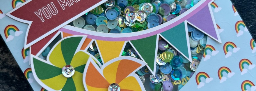 For this one I did use the Kingston Crafts rainbow kit for both the cardstock making the card and the embellishments I added – like the sentiment and the paper windmills and the bunting across the aperture.