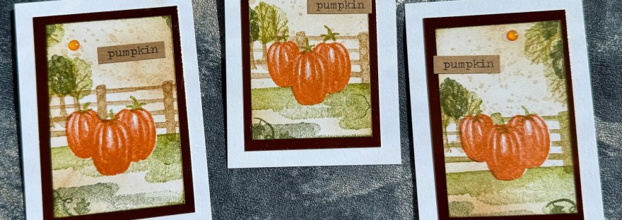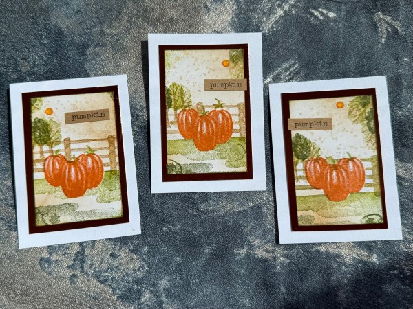 I decided to do little framed panels with the orange foiled cardstock and the white cardstock and then stamped little scenes using the Pumpkin scene stamps my daughter bought me last year for my birthday.