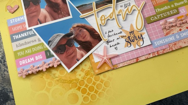 I added some perspectives, daisy trim and bits and bobs from the stash and the puffy sticker for the title. Good to use some bits up that have been around a little while!
