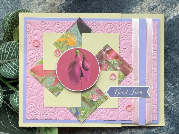 This is one of the sketches with the fab pinwheel type of design. I turned the sketch to make a landscape design and added embossing to the pink background panel. I also added some scrap ribbon from the stash.
