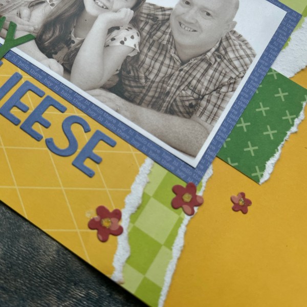I wanted to make a really colourful page with lots of the papers in the Everyday Papers kit and I find when I use lots of colours I often want a more neutral photo – so I went with a sepia photo from when we had a photoshoot back in 2016 – so quite a while ago (if only we were still this young! 🤣) – and today is a perfect time to post this page because the photo was taken in CenterParcs in Cumbria – and this is where we currently are on a weekend away!