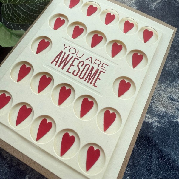 I used the big dots cover plate die and coordinating stamp for the front and then added the punched hearts into the centre of each ‘dot’.