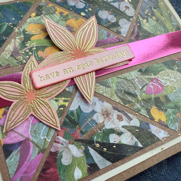 The sketch itself is lots of triangles and because the two patterned papers this was made from are both slightly indistinct floral/foliage images this looks like a fun mixed media background with the bit of Kraft peeking through.