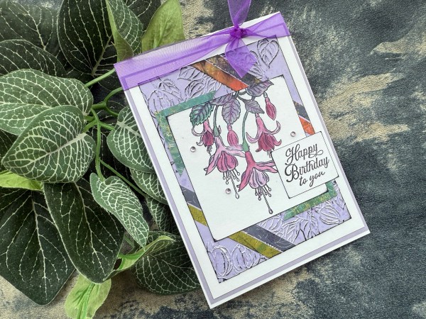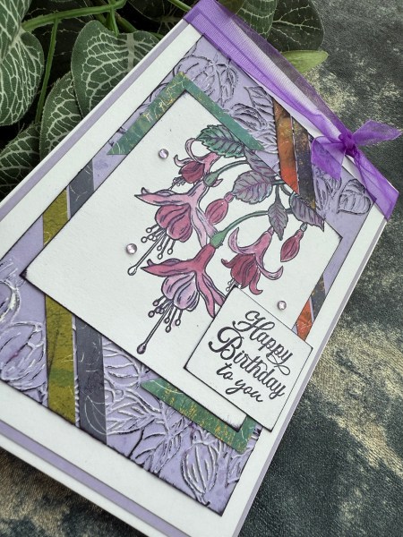 I added embossing and inking on this one – also the large fuschia image as the focal point which I’ve not used often in this series of using up the magazine kit.