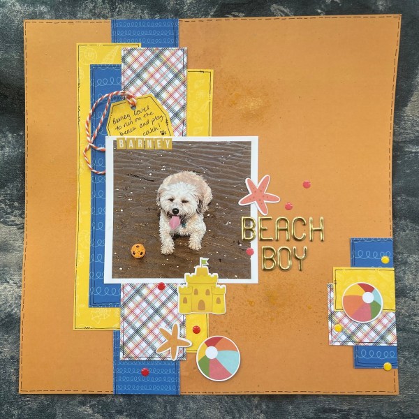 I started with the pic of him on the beach with his little ball and the page inspiration came from that – a solid orange base the yellow shell design paper and the blue squiggle wave paper. I also added in the plaid type design for some contrast.
