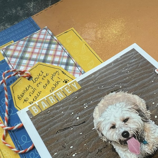 I also added some of the larger enamel dots as embellishments. I used some stickers from my stash for the title and adding Barney’s name on the photo.