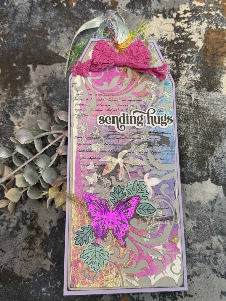 I then mounted the panel onto the lilac tag again cut a little larger than the grey later. I punched the hole and then threaded through some fun ribbon and thread trims including a beaded one. I also added the trim bow which I think balanced it nicely.