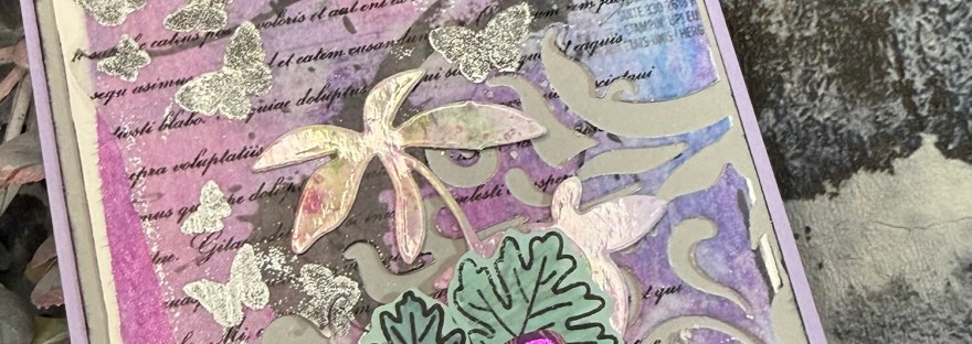 I added the die cut leaf and the die cut and foiled butterfly that were on the desk and then stamped and coloured and fussy cut the green leaves to give the butterfly a grounding.