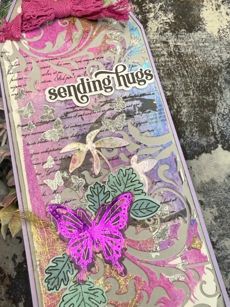 This created an interesting background but I wanted to also add some texture so used the Tim Holtz dies that cut out from the panel at both the top and the bottom. This gave me some interesting pattern and I then glued this panel down onto a grey card and cut it to be slightly larger than the original tag.