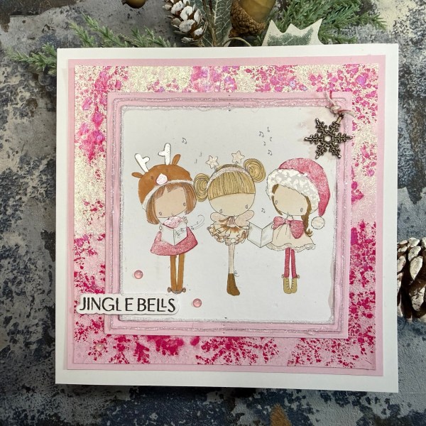 I didn’t have any images I could use to really get today’s theme to work so I went to All Dressed Up digital stamps and found this gorgeous image of the three girls carolling and bought it. Digital stamps are so affordable for this kind of challenge to just boost your supplies! And All Dressed Up is a favourite of mine – I love the style of the images.