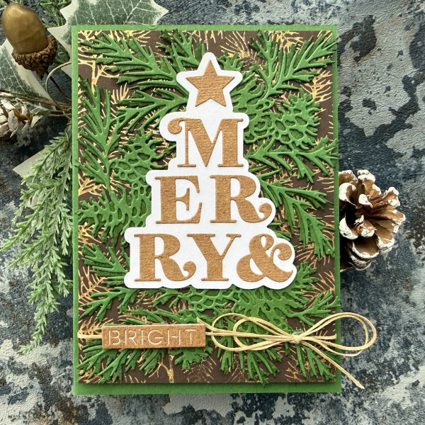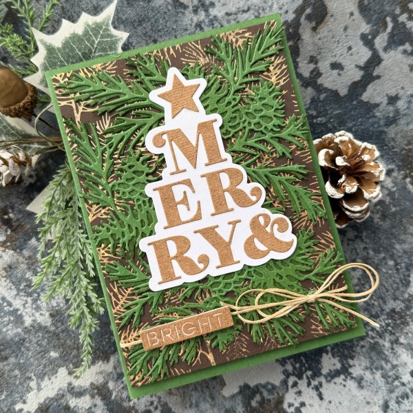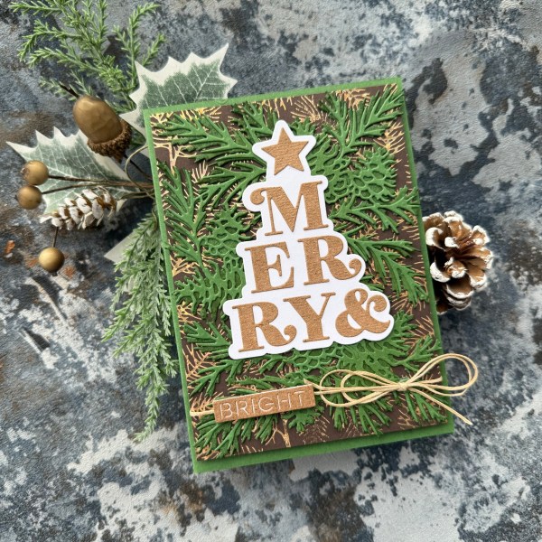 With Merry Little Moment I knew I just needed a Merry for my project – and so I decided to revisit two of my fave bits of stash – foiled pine needles background plate and the pine cones intricate die cut.