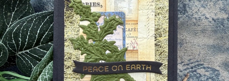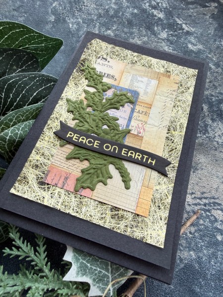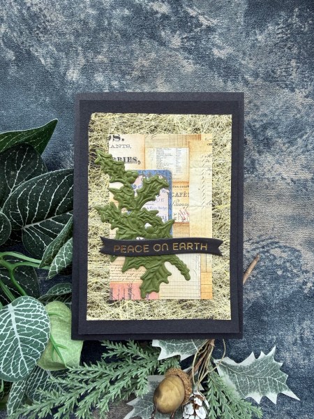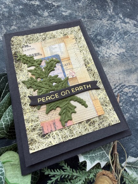I layered the patchwork panel onto a piece of gold angel hair paper (I found lots of this when tidying the craft room so expect to see it quite a bit!) and then added the holly branch I had die cut and embossed when I first got the die/folder back in September.