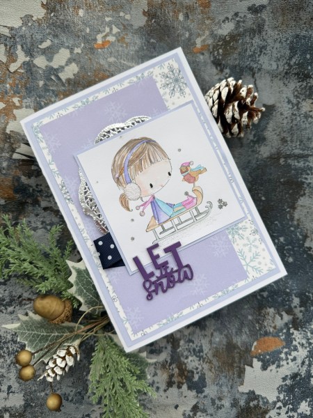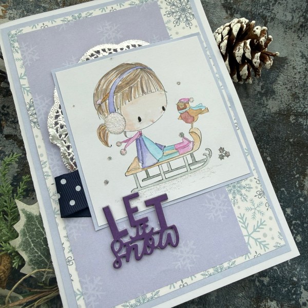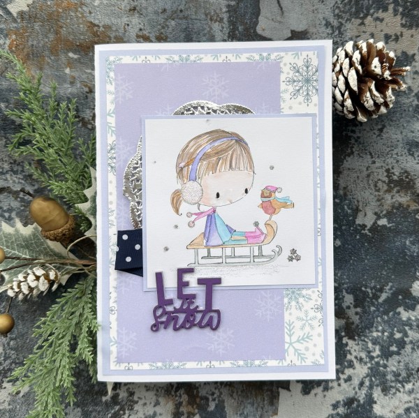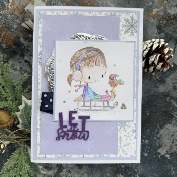 Our theme at Creative Knockouts is Winter Wonderland and I used this adorable All Dressed Up stamp Sledging all the way for my delicate winters card.