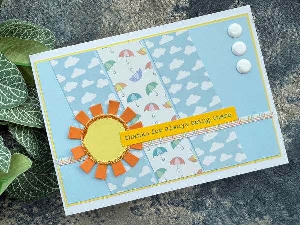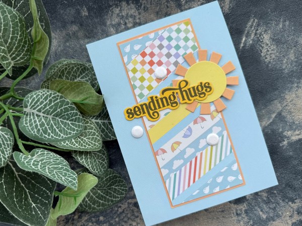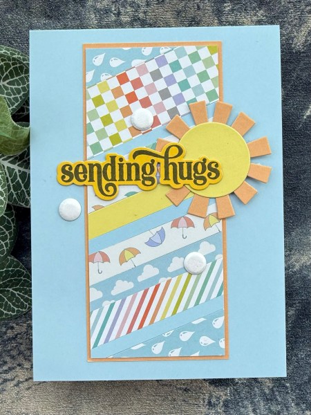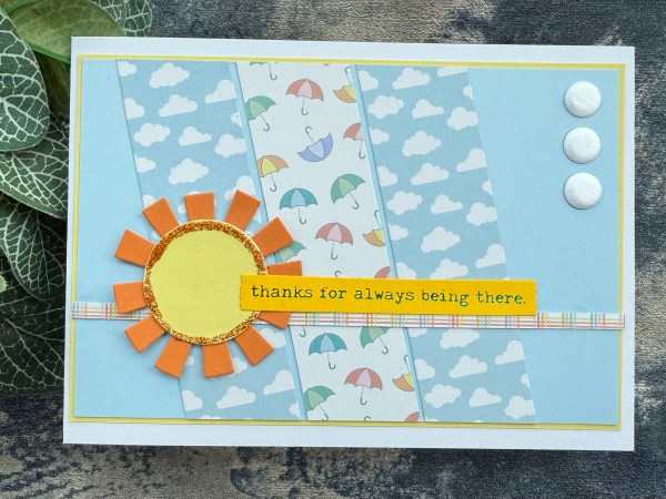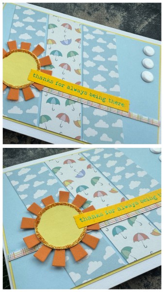 Lastly the left over strips from the kit – my usual technique of just creating stripes across a panel – this time adding in the blue and yellow stripes too – then added the fun die cut sun and the Altenew stamped and die cut sentiment with the card candi to finish off!