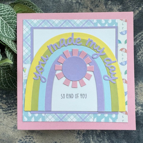 This one I used three stripes of the paper to do the background to the die cuts. I then chose a rainbow I had made using the yellow, green, blue and lilac cardstock.