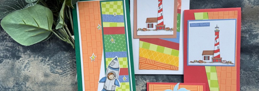 I am back with another ‘tidy up and use up stash’ project – I found a pouch that had leftovers of scrap papers I had made design team projects from for Kingston Crafts mainly using either the summer collection or the everyday papers and decided to make use of them as best I could … from this four cards made!