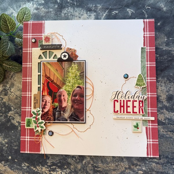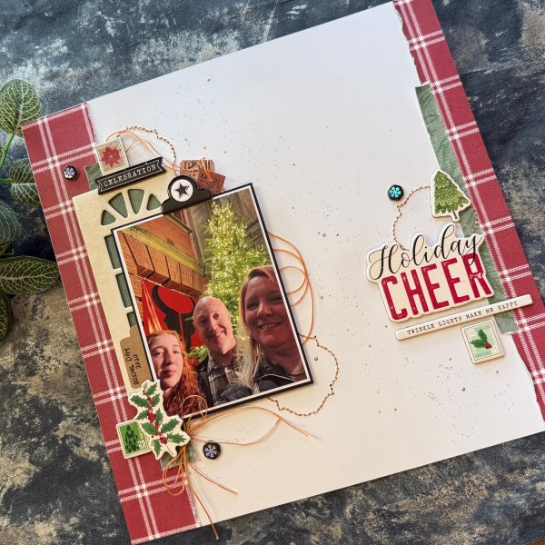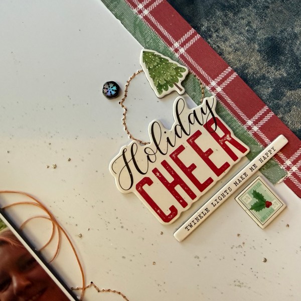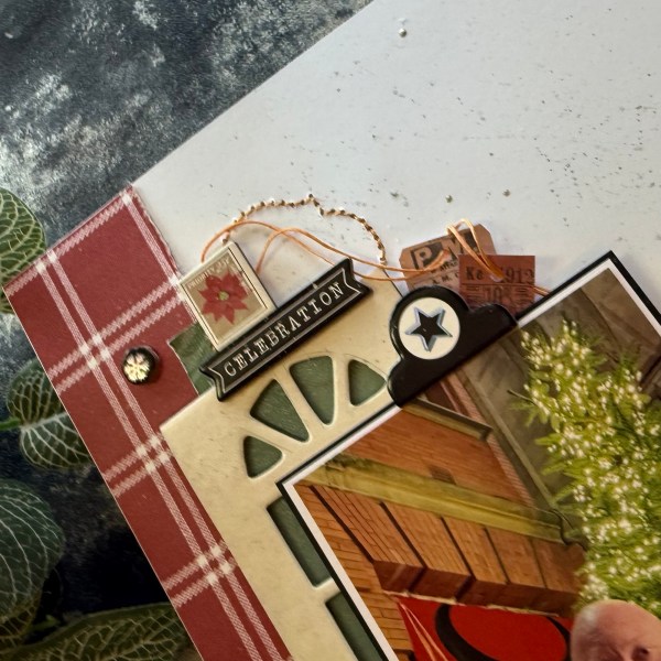 Sarah designs lovely pages but this has too much white space for me to feel comfy with so hence sewing … I chose some fun label shapes to add and then I also added in the thread bow and trails from the tags I made … and of course shimmery splatter!