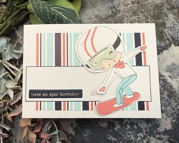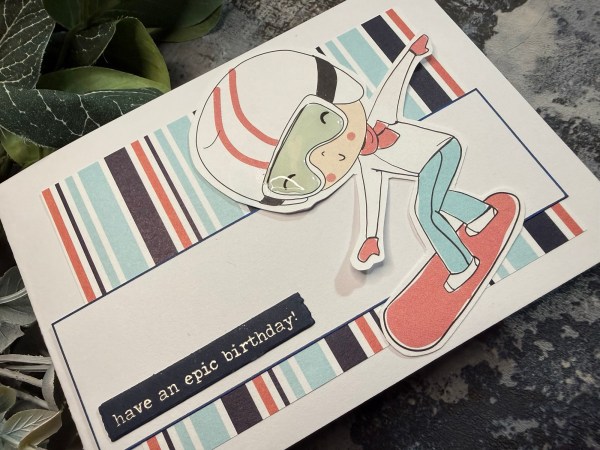 I added a simple panel of white and the foiled sentiment. I also added the glossy accents to the mask on the boy to give it dimension and shine.