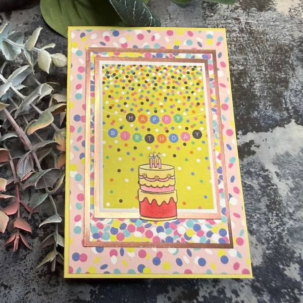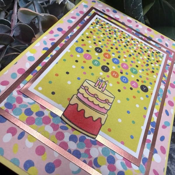 I added some foiled cardstock layers and then the lawn Fawn cake image I stamped, stencilled and die cut. I then decided to fussy cut it rather than go with the white outline of the die cut.