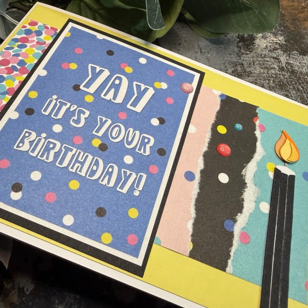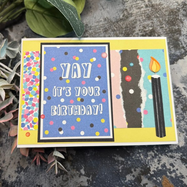 Some torn scraps become a fun background with the card topper and a die cut candle to finish off!