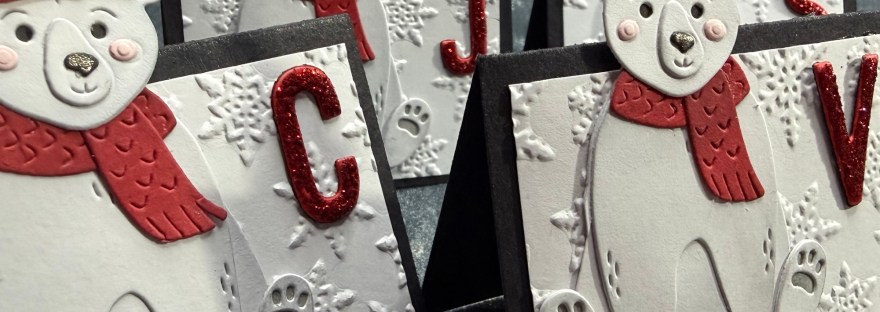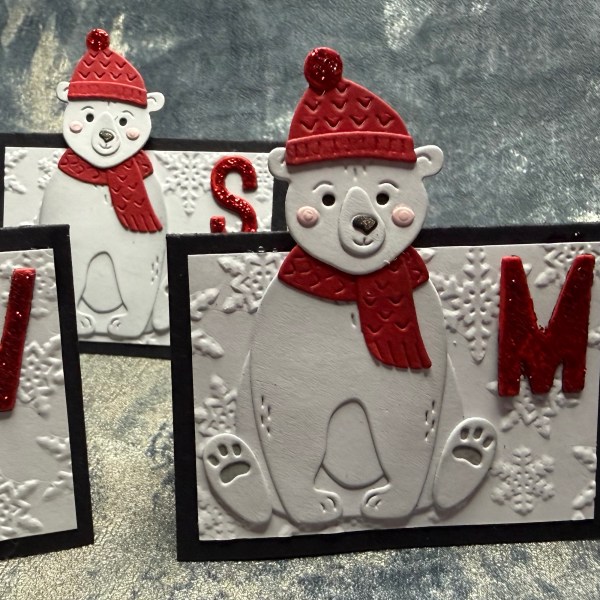 I used the cute little Polar Bear Pals dies to create five lovely bears. I inked the elements to give shading and then added the glitter glue to the bobble on the hat. It took me about an hour to cut and then assemble these fellas. You could easily personalize them with different coloured accessories or leave the scarves and hats off if you would prefer. I went with them all the same to match the colour scheme in my family room.