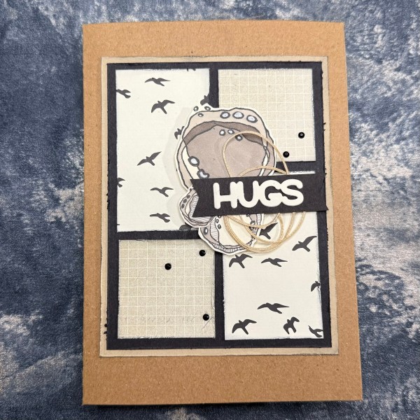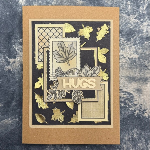 I also added ink to the patterned papers too – this made them look like they went together better. The Waffleflower fall leaves set of dies and stamps and stencils worked so well for this card – and cute to see the Hugs die cut sentiment on the top!
