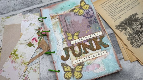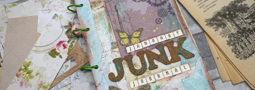 So on the 2nd Jan I watched a Lindsay Ostrom YouTube video and it inspired me to make a junk journal for January. I didn’t actually follow her tutorials or anything but instead used some old Roald Dahl books that I had already taken pages from for other art journal work and created this journal. I was sorting out old papers on the day and found a couple of pouches of old magazine kits (crafters companion and indigo Blu ones) and popped them together along with other scraps to make a pouch for grabbing to decorate each page.
