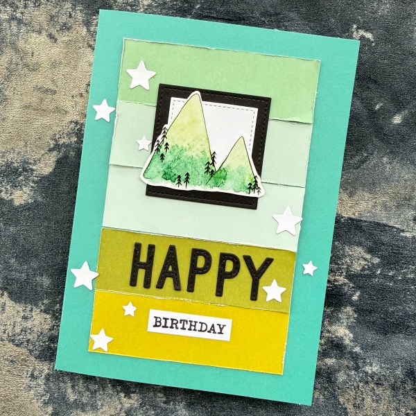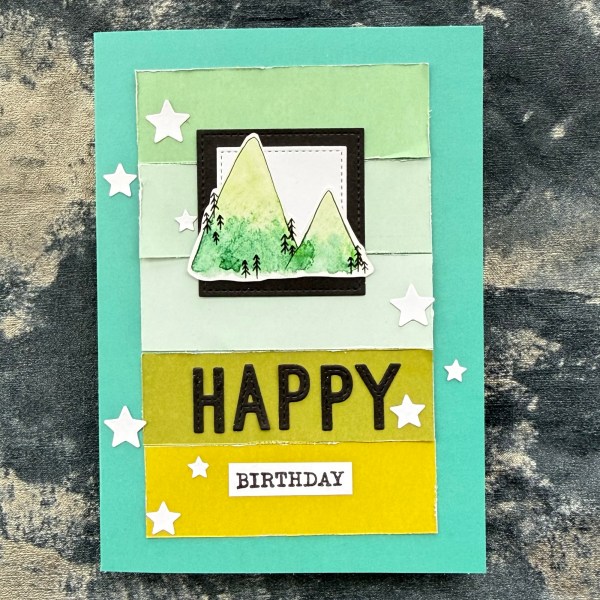 After cutting it out I then went to town with die cutting – two squares to frame the image, the letters for the Happy and some stars to embellish! I then used an old Indigo Blu magazine set to stamp the sentiment!