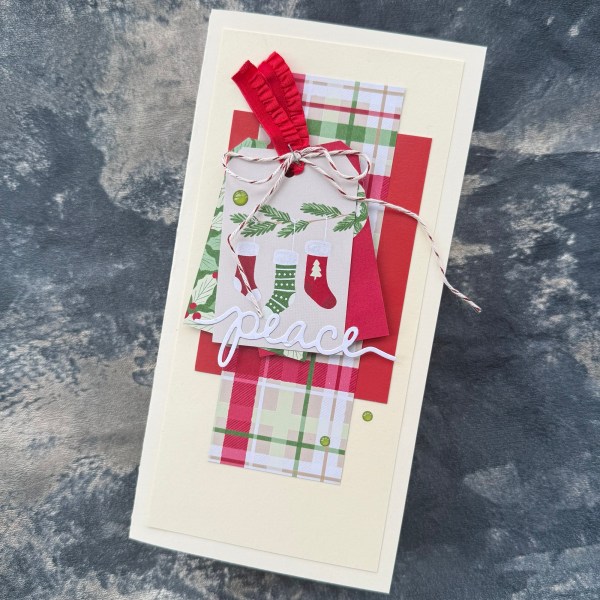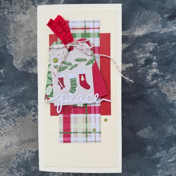 I went with a cream base to make it a little different and then a strip of the patterned paper and a piece of red cardstock that was on the desk, three cut apart panels made into tags and layered, some bits of twine and ribbon in place with the tiny attacher – then some gems and a die cut word to finish off! Simple!