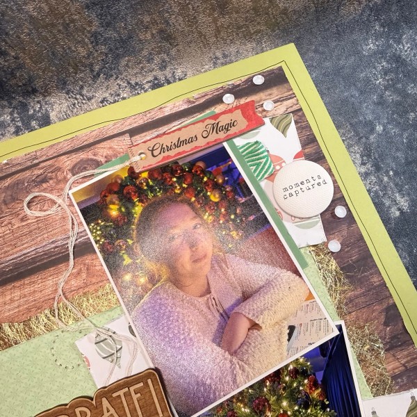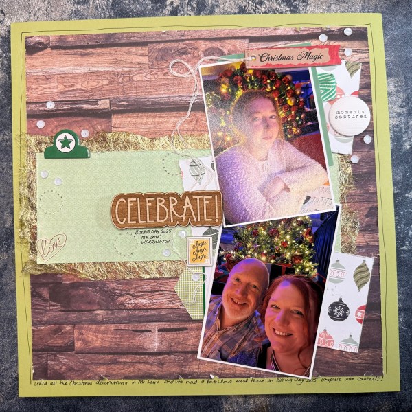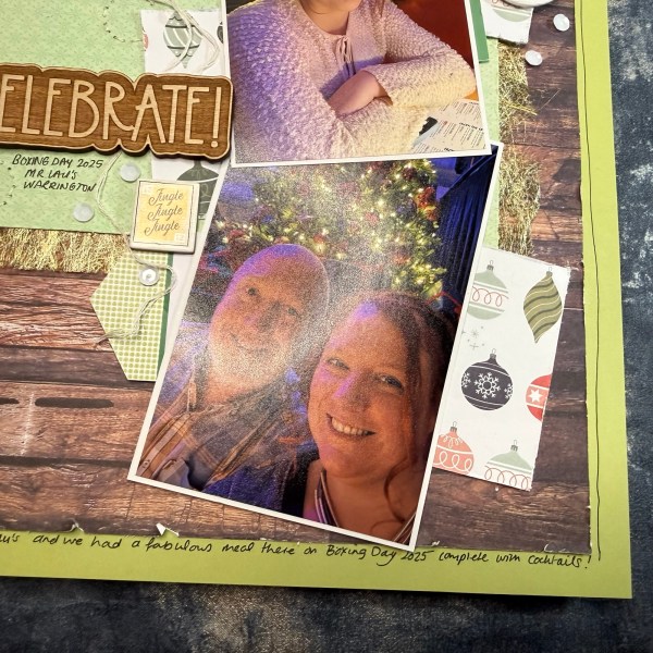 I chose a green base, the wood plank background, some green paper (I used the reverse of the green to mat the photos with white) and then the baubles paper from Kingston Crafts.
