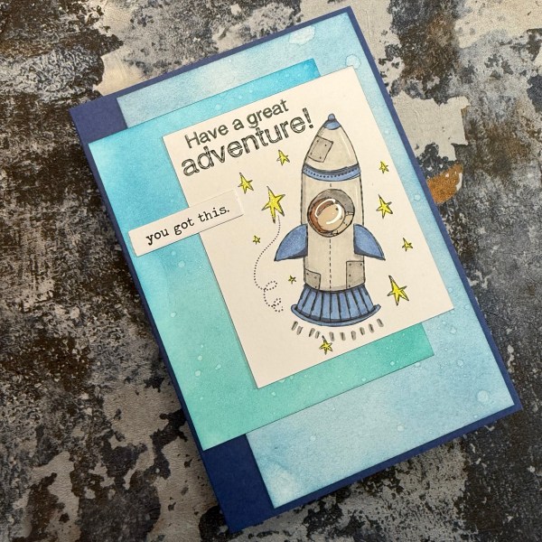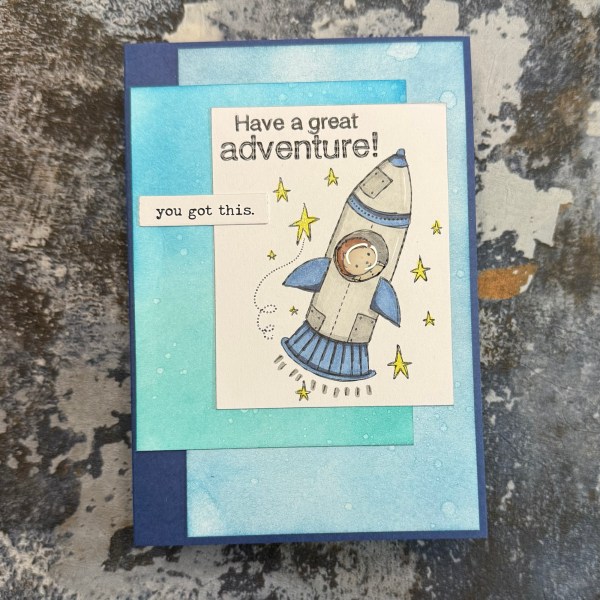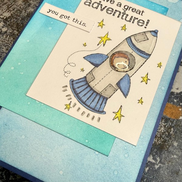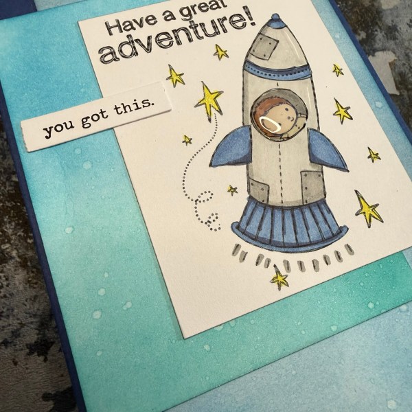 I finished off with a die cut press plate sentiment from Dina Wakely, some wink of Stella for the stars and some glossy accents for the window on the rocket.