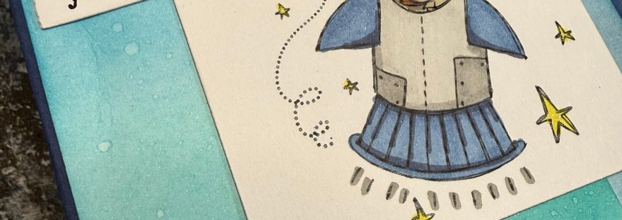 I finished off with a die cut press plate sentiment from Dina Wakely, some wink of Stella for the stars and some glossy accents for the window on the rocket.