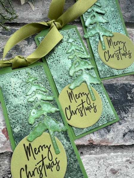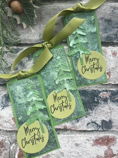 Once they were all adhered together as layers I added some green ribbon to the tops of the tags – perfect for Christmas wrapping later in the year – much later in the year! 🤣