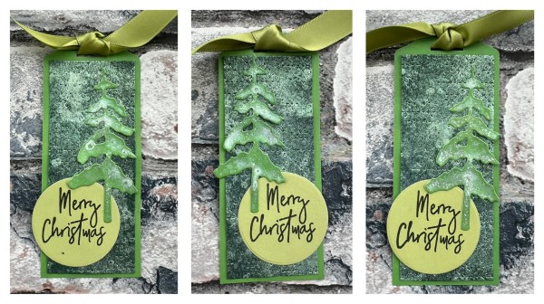 I played with the shimmer spritz on some dark green cardstock to create a really fun almost northern lights sky type effect and then I die cut it with the snowflake texture die which punches the pattern rather than cuts out a shape. From this I created the three panels for tags.