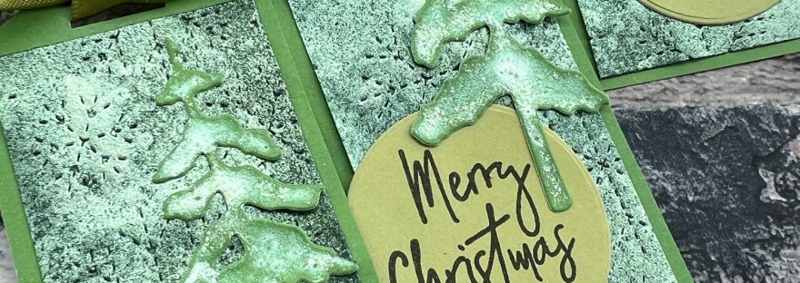 I played with the shimmer spritz on some dark green cardstock to create a really fun almost northern lights sky type effect and then I die cut it with the snowflake texture die which punches the pattern rather than cuts out a shape. From this I created the three panels for tags.