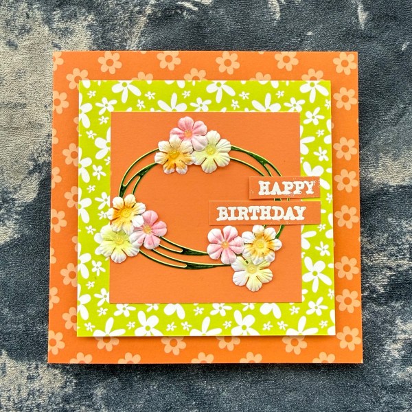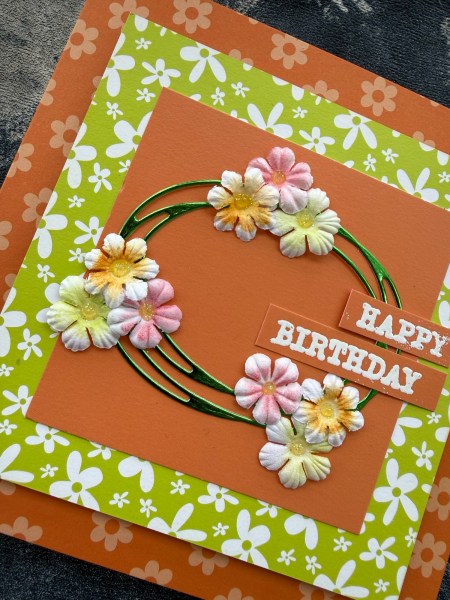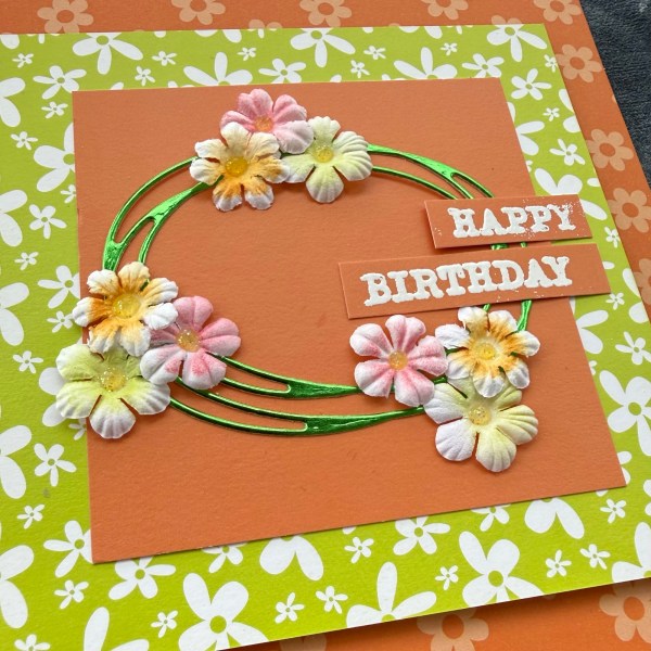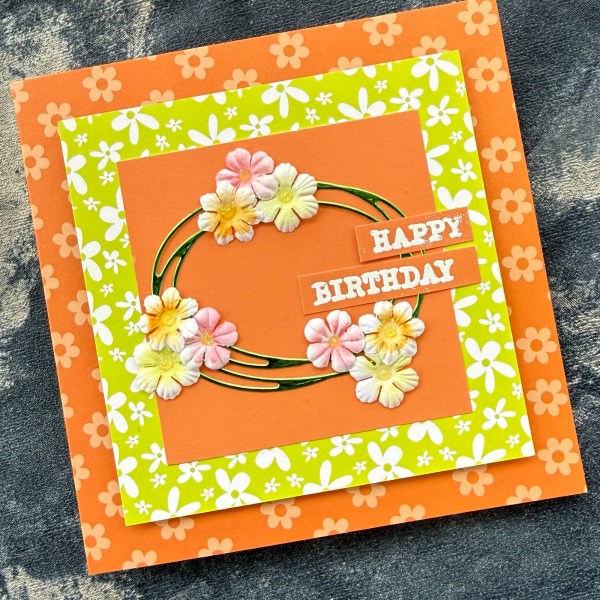 I grabbed cheerful patterned cards and made layers for the card base which is 5×5 and then die cut the swirly oval for my wreath type focal point from the foiled cardstock.