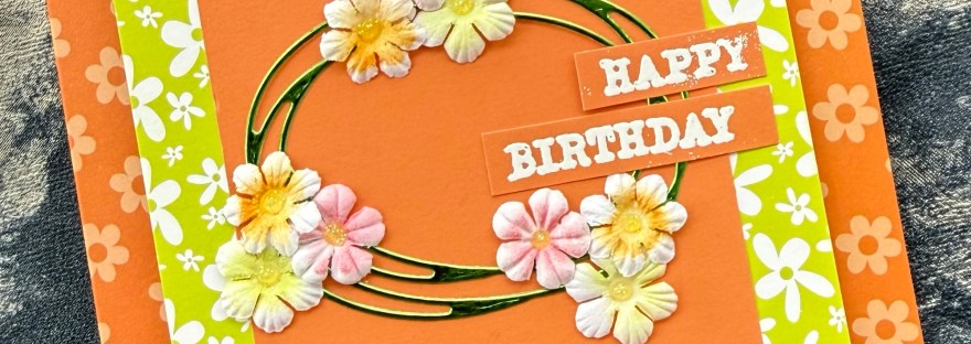 I grabbed cheerful patterned cards and made layers for the card base which is 5×5 and then die cut the swirly oval for my wreath type focal point from the foiled cardstock.