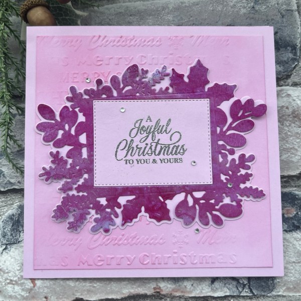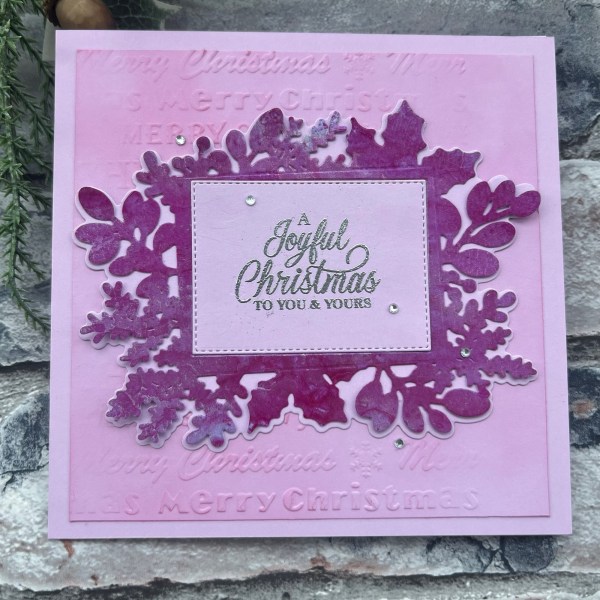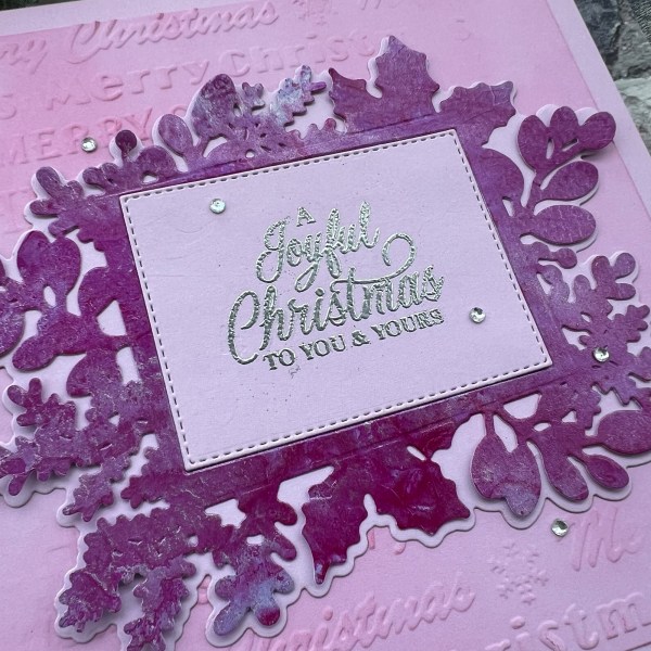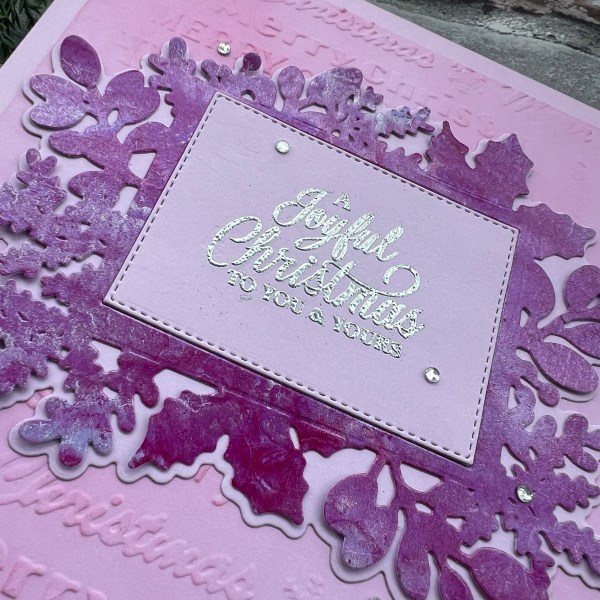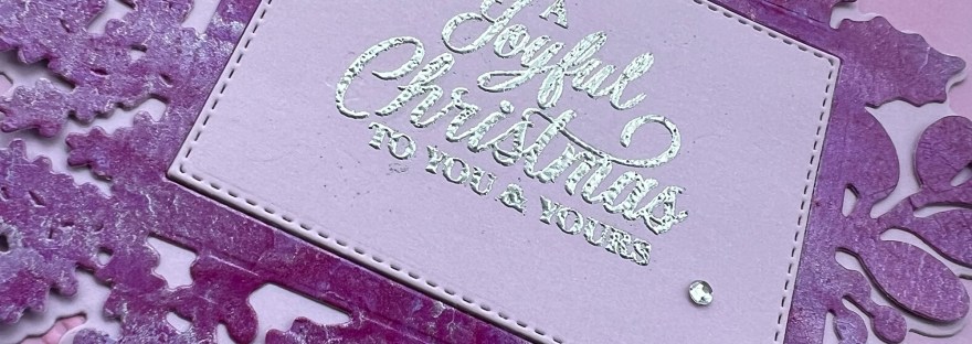 I really loved the look of the Sugarplum spritz when I opened the box so this is the first one I played with – I took a piece of lilac cardstock from the pastel cardstock and then totally coated the piece with the sugar plum and then for good measure I also added in the silver colour in a few places to add some different elements. Well as I went heavy this took a while to dry but wow! How gorgeous it is! I decided to go for a big die cut element for the focal point of the card and cut this from that gorgeous pink swirly shiny and shimmer panel!