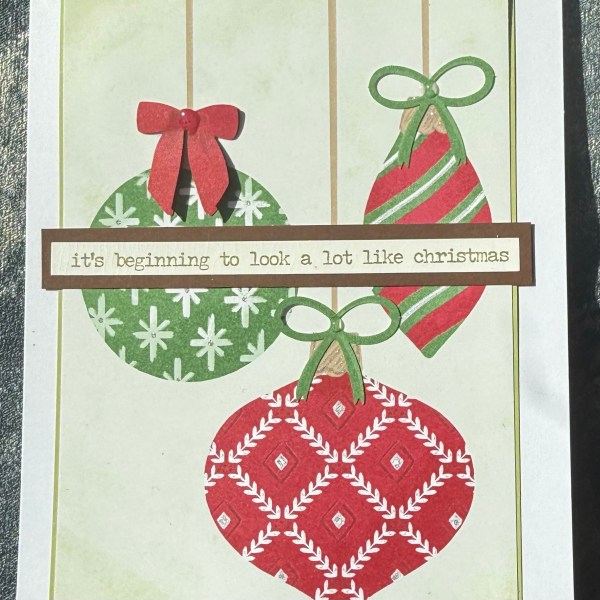 I went with a panel of the baubles paper which I mounted on some green cardstock with a thin border to frame. Then I added lots of shimmer using a shimmer gel pen.