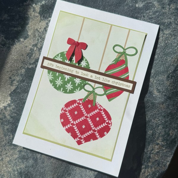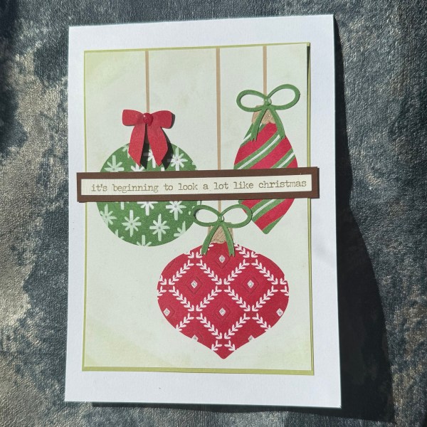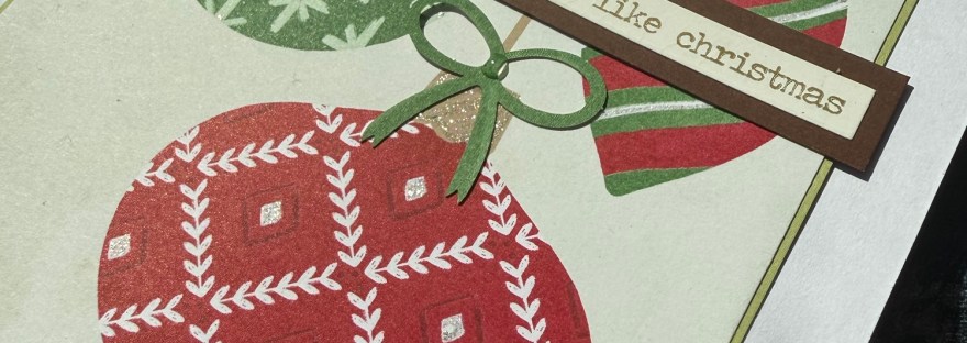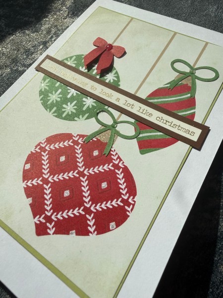 I added the die cut bows for the baubles … the green I stuck flat and then the red I doubled up and added the top one with the ribbon curved up so there was some dimension and a feeling of movement.