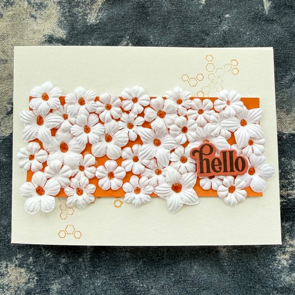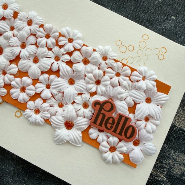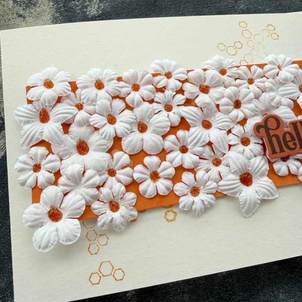 I decided to keep the rest of the card quite simple – a white base with a little bit of orange stamping with a hexagon random stamp.