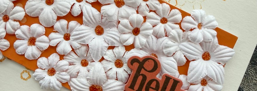 My second project using the paper flowers pack from Kingston Crafts and I went to town with the flowers! I too a piece of cardstock that did actually have flowers on it as a pattern and using those flowers as a guide I stuck all different types of the flowers down to create a beautiful textural panel with bits of the orange background peeping through.