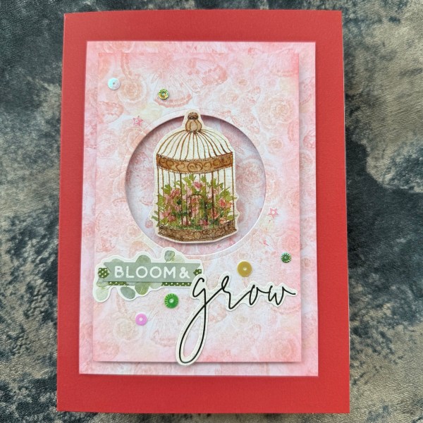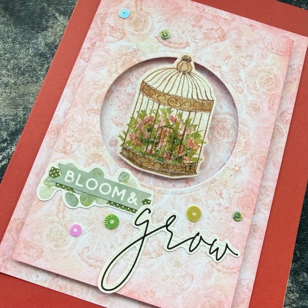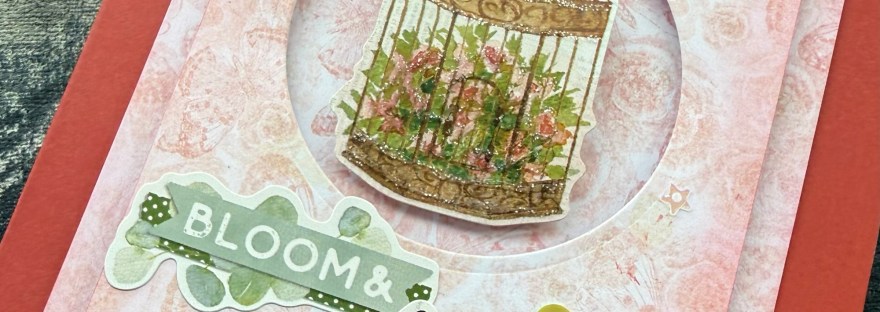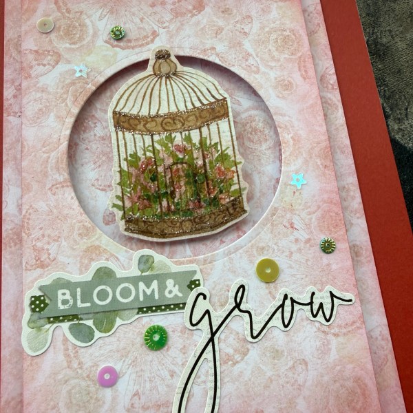 My first play with the mechanism was on this card where I turned the pretty birdcage sticker into a moving popped up focal point!