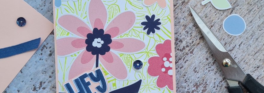 However the rules of the UK stampers forum is to include stamping so I grabbed the Tropical Hideaway background stamp and Parakeet Party to give this a fabulous stamped and bright background. I then added the fussy cut paper flowers.