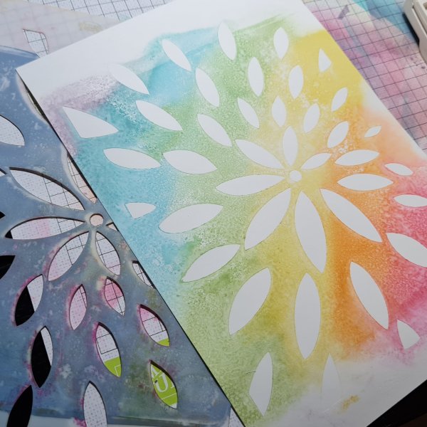 This time I grabbed a piece of scrap and after inking the Aall & Create stencil with some ink I spritzed it with water and then pressed the scrap onto it so it picked up the inks.