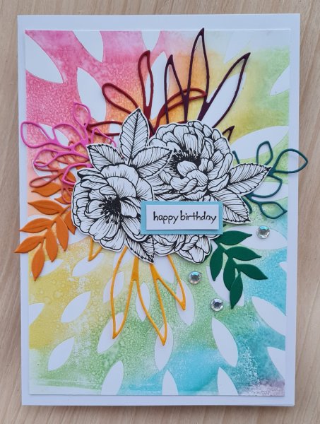 Not 100% sure about the placement of stencilling, think it might have looked better more central under the bowl of foliage, but love the final card.