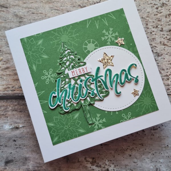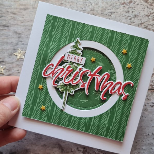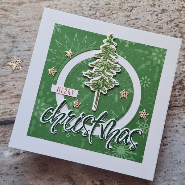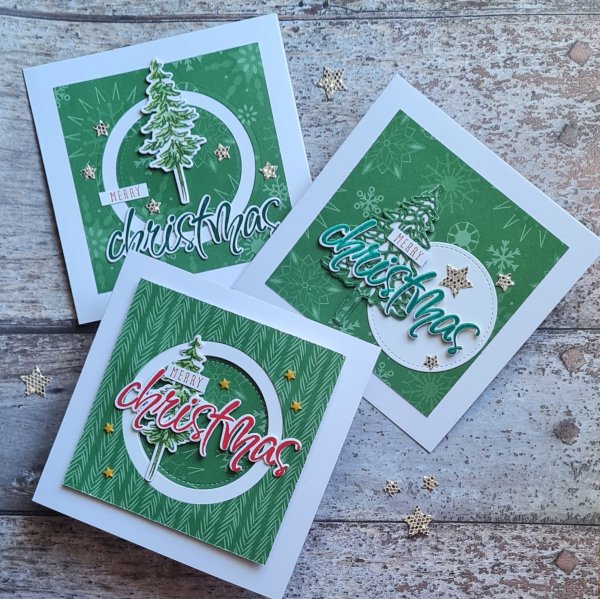 For the circles I made them all using the Christmas word and chose to add Merry from the Christmas to Remember set. I stamped and die cut a few trees from the In the Pines set and then the leftover bits of green dsp I die cut the filigree tree and added this to a white die cut.