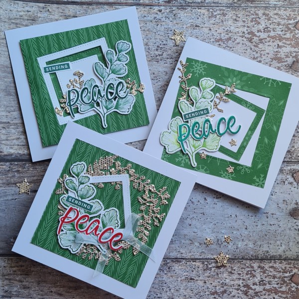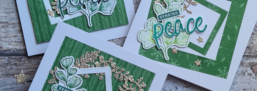 These ones I chose to use non Christmas stamps and dies to add decoration … the Nature’s Prints bundle. I thought the leaf worked well with the Peace word. I blended the ink on the stamp to give a more interesting stamped image.