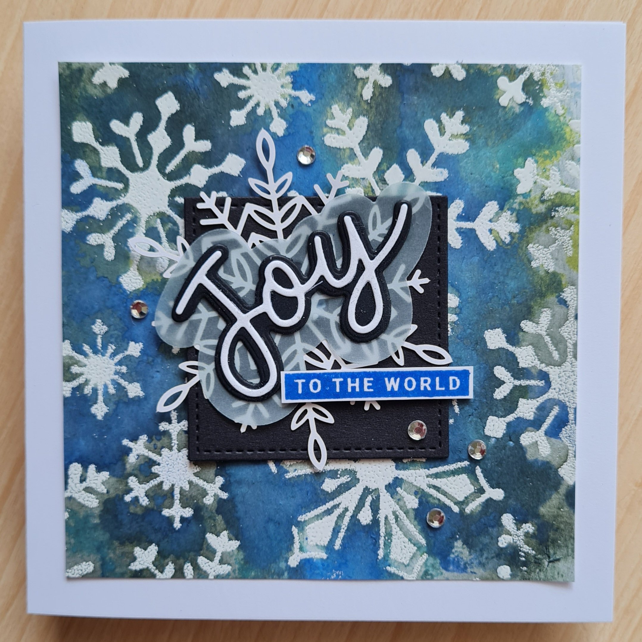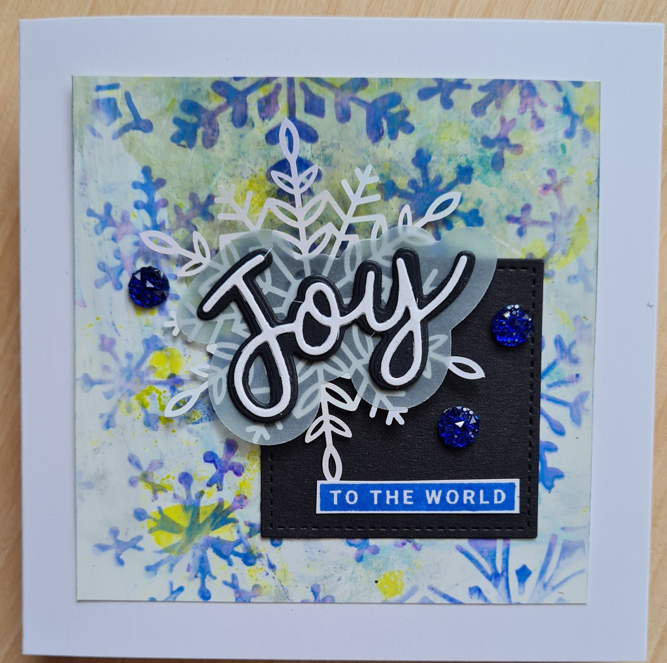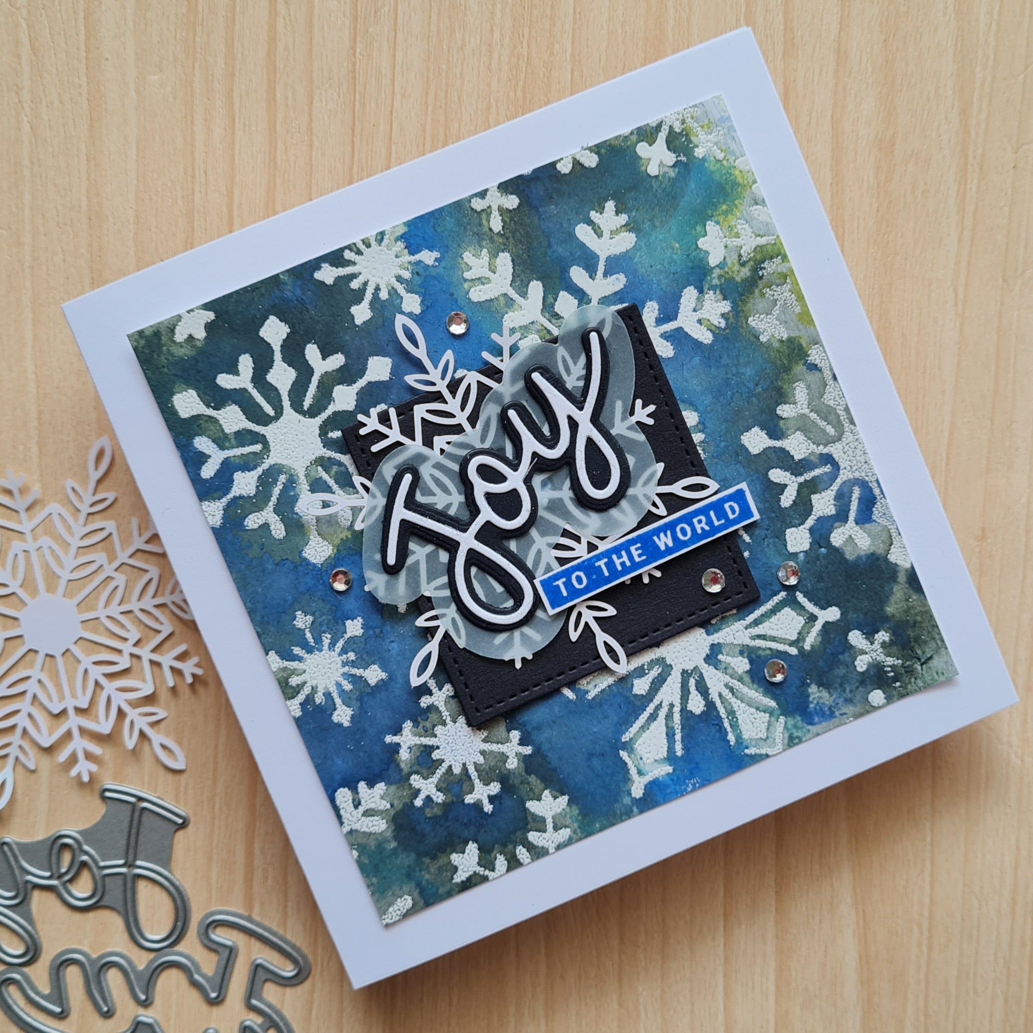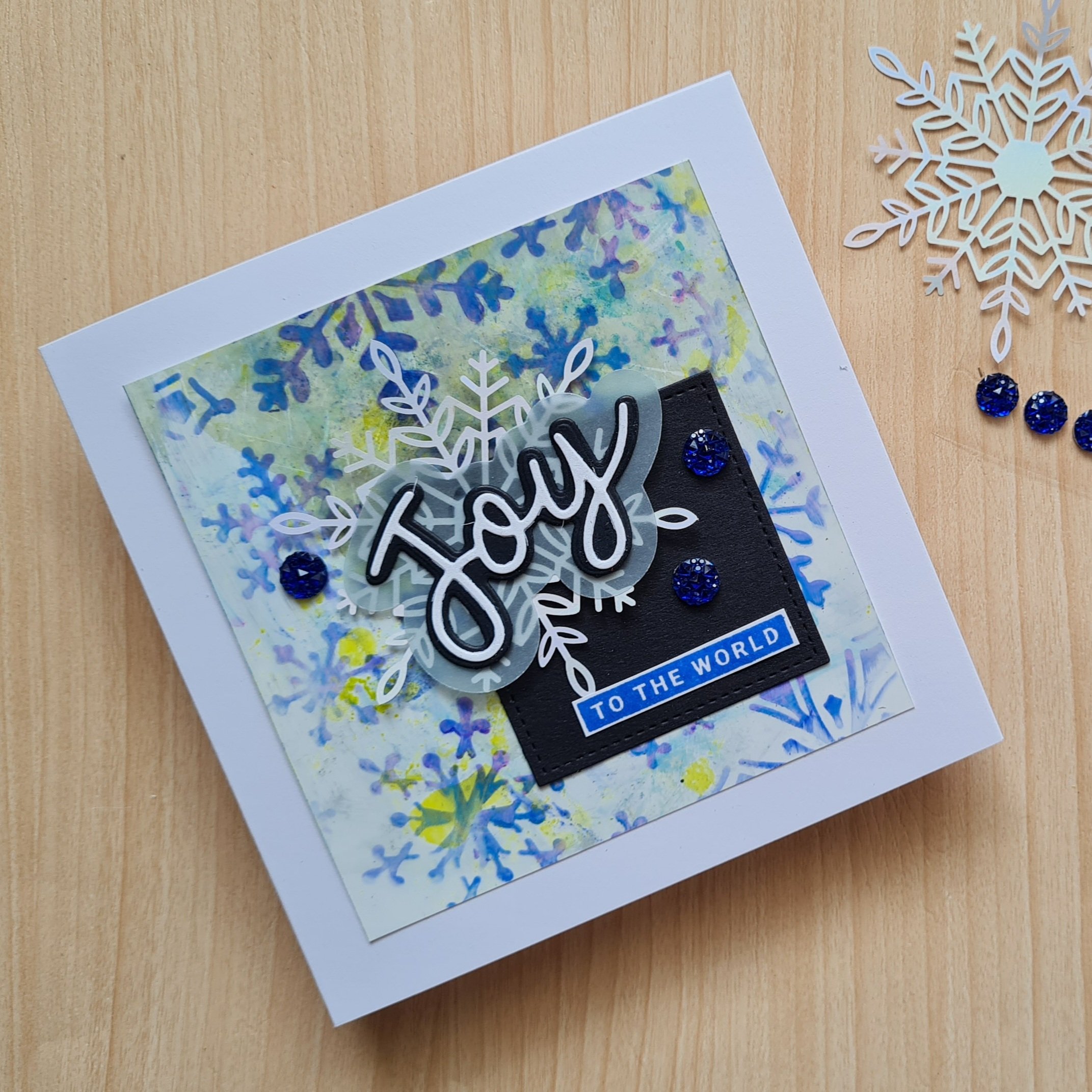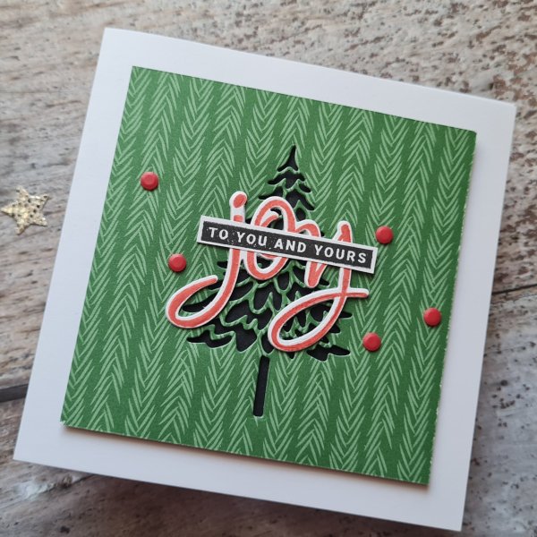 I had black cardstock die cut squares on the desk already so I used them to ground the focal image and chose to add a laser cut snowflake, and then the Joy from Peace and Joy (still an absolute favourite stamp set).